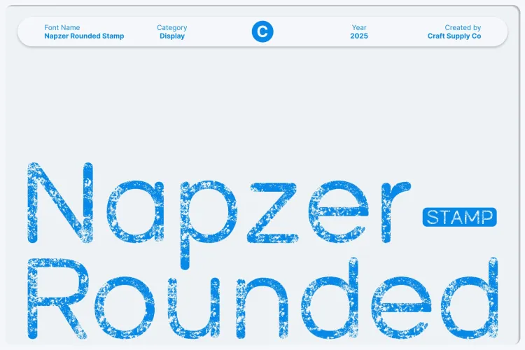 Napzer Rounded Stamp brings strong, friendly curves and a textured finish. It balances the dramatic blackletter styles with approachable aesthetics, making it ideal for captions or interactive digital visuals.